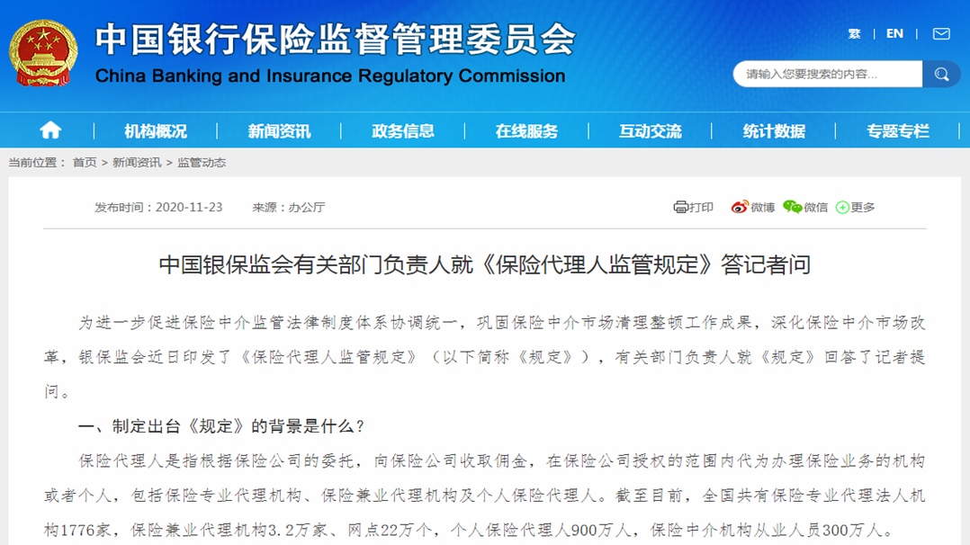 经历2018年7月、2020年4月两次征求意见后,中国银保监会于2020年11月23日正式发布《保险代理人监管规定》(下称《规定》),并将于2021年1月1日起施行。 “新规将一改长期以来,保险代理人法律关系不清楚、监管体系不明、管理标准不同的弊病,利于统一监管尺度,形成监管合力。”此次《规定》将保险专业代理机构、保险兼业代理机构以及个人保险代理人制度纳入同一个文件的做法,也得到业内人士的一致认可。 据银保监会有关负责人透露,截至目前,全国共有保险专业代理法人机构1776家,保险兼业代理机构3.2万家、网点22万个,个人保险代理人900万人,保险中介机构从业人员300万人。